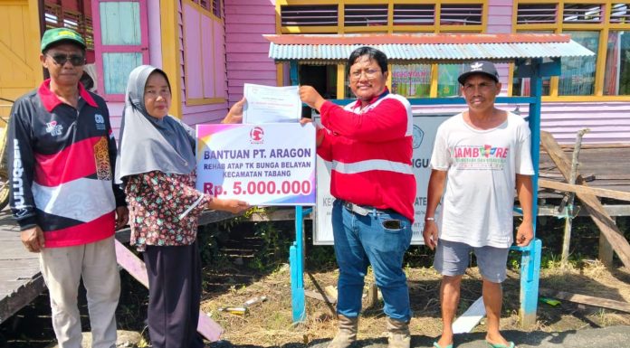 KUTAI KARTANEGARA. Pihak perusahaan batu andesit / batu pecah di wilayah Kecamatan Tabang PT. Aragon membantu rehab atap gedung sekolah Taman Kanak Kanak / TK. Bunga Belayan di jalan Mulawarman Desa Sidomulyo Kecamatan Tabang. Bantuan tersebut diserahkan oleh Mohammad Afiat mewakili PT. Aragon yang diterima oleh Ellia M. Haris Kepala Sekolah TK. Bunga Belayan beberapa Minggu lalu.