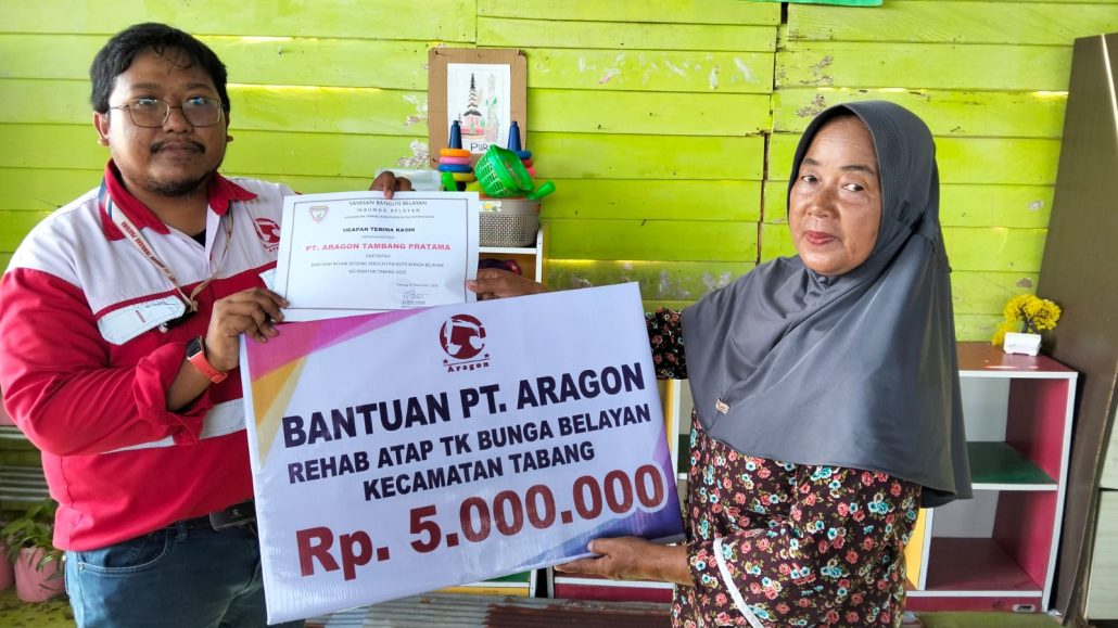 KUTAI KARTANEGARA. Pihak perusahaan batu andesit / batu pecah di wilayah Kecamatan Tabang PT. Aragon membantu rehab atap gedung sekolah Taman Kanak Kanak / TK. Bunga Belayan di jalan Mulawarman Desa Sidomulyo Kecamatan Tabang. Bantuan tersebut diserahkan oleh Mohammad Afiat mewakili PT. Aragon yang diterima oleh Ellia M. Haris Kepala Sekolah TK. Bunga Belayan beberapa Minggu lalu.