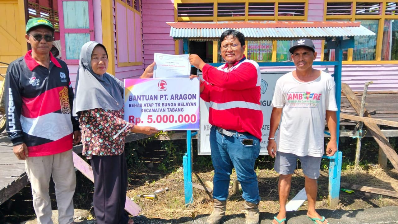 TK. Bunga Belayan yang berdiri sejak tahun 2003 itu merupakan sekolah swasta yang terus mencetak generasi emas dalam bidang dunia pendidikan anak usia dini. Dalam kesempatan itu Ellia M. Haris mengucapkan terima kasih kepada pihak perusahaan, sehingga atap sekolah tidak bocor lagi dan sekolah TK makin terlihat indah. “Terima kasih kepada pihak perusahaan yang telah membantu kami. Semoga perusahaan yang membantu bertambah maju usahanya” ujar Emilia pada media GempitaNews. Sementara dari pihak perusahaan berharap bantuan ini dapat terwujud dengan baik sehingga kami berjanji akan membantu lagi kedepannya untuk kemajuan dunia pendidikan di wilayah kerjanya yaitu kecamatan Tabang. “Semoga bantuan ini bermanfaat, doa kan kami dapat membantu TK. Bunga Belayan di tahun berikutnya” ujar Mohammad Afiat didampingi Al Afghani dari kehumasan PT. Aragon. (Var)