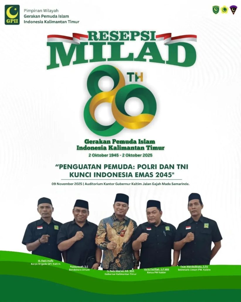 KUTAI KARTANEGARA. Dalam rangka memperingati hari ulang tahun atau Miladnya ke-80 tahun, Gerakan Pemuda Islam Indonesia (GPII) Provinsi Kalimantan Timur menggelar Jalan Santai dan Senam Ceria yang akan dilepas oleh Ketua Dewan Syuro GPII Kaltim Drs.H. Mursidi Muslim. MM yang akan dilaksanakan Jum’at pagi (05/12/2025) di Halaman Sekolah TK. Gempita Jalan Gerbang Dayaku Desa Loa Janan Ulu Kecamatan Loa Janan Kukar. Kegiatan tersebut merupakan rangkaian kegiatan peringatan Milad GPII di Provinsi Kaltim selain sebelumnya melaksanakan Diskusi Pemuda Islam dan malam ramah tamah dan tabur bunga di makam pahlawan Tenggarong.