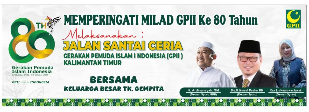 KUTAI KARTANEGARA. Dalam rangka memperingati hari ulang tahun atau Miladnya ke-80 tahun, Gerakan Pemuda Islam Indonesia (GPII) Provinsi Kalimantan Timur menggelar Jalan Santai dan Senam Ceria yang akan dilepas oleh Ketua Dewan Syuro GPII Kaltim Drs.H. Mursidi Muslim. MM yang akan dilaksanakan Jum’at pagi (05/12/2025) di Halaman Sekolah TK. Gempita Jalan Gerbang Dayaku Desa Loa Janan Ulu Kecamatan Loa Janan Kukar. Kegiatan tersebut merupakan rangkaian kegiatan peringatan Milad GPII di Provinsi Kaltim selain sebelumnya melaksanakan Diskusi Pemuda Islam dan malam ramah tamah dan tabur bunga di makam pahlawan Tenggarong.